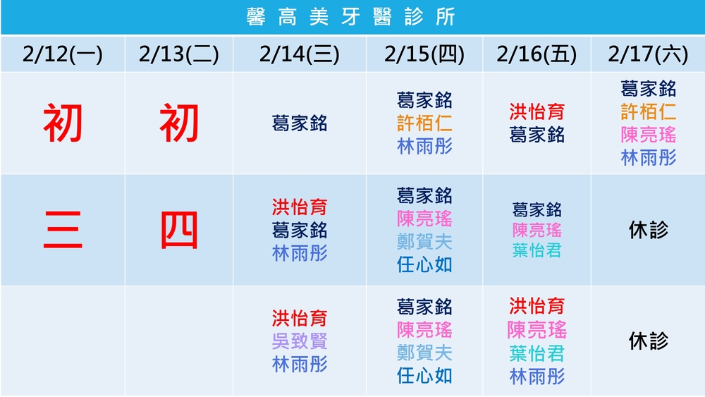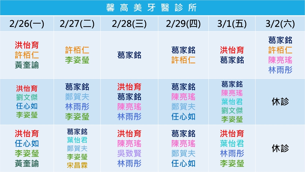馨高美牙醫|2024.2月門診表|