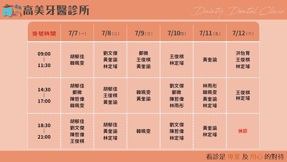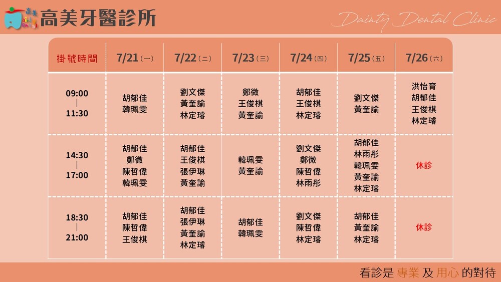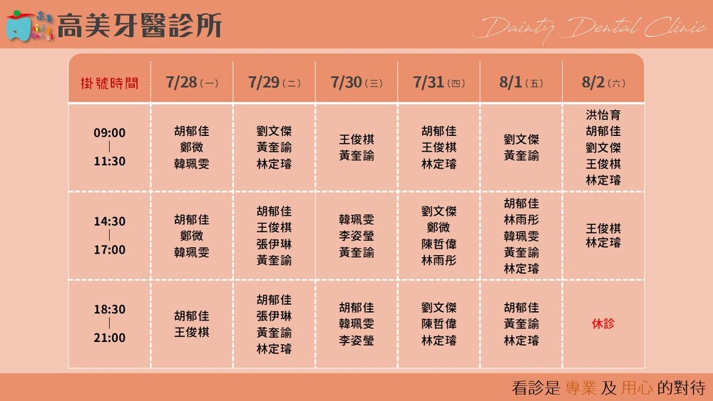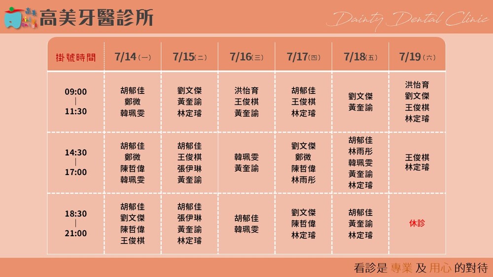 |Dainty Dental Clinic| 高美牙醫診所 |電話|(07)555-5898 |傳真|(07)555-7742 |地址|高雄市鼓山區美術館路32號 歡迎來電預約看診。 高美牙醫聯盟 關心您!