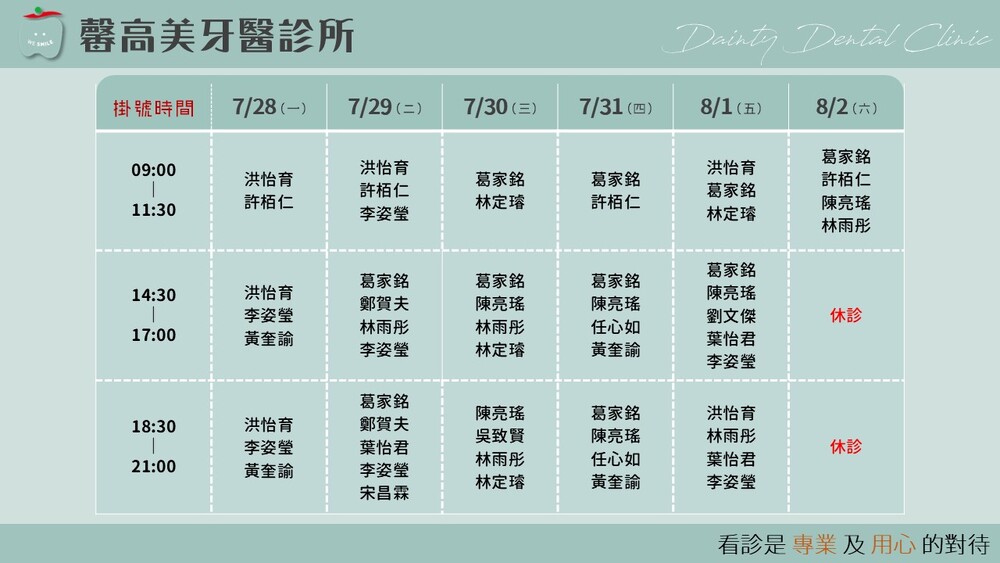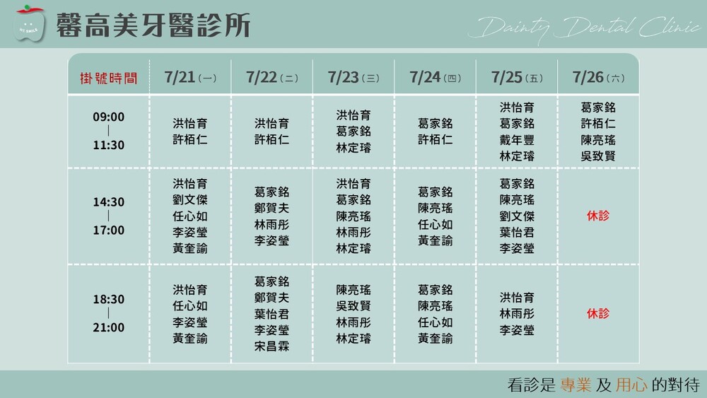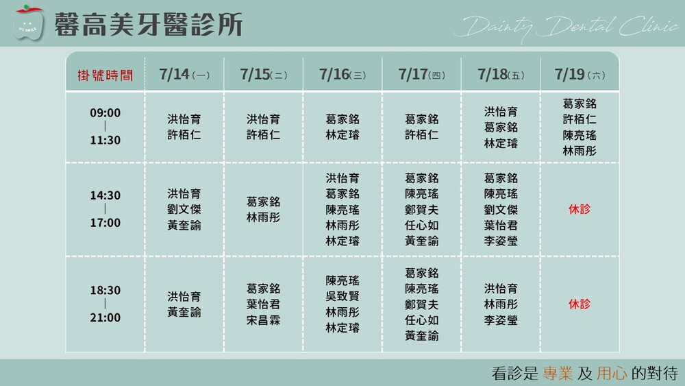 馨高美牙醫|2025.7月門診表|