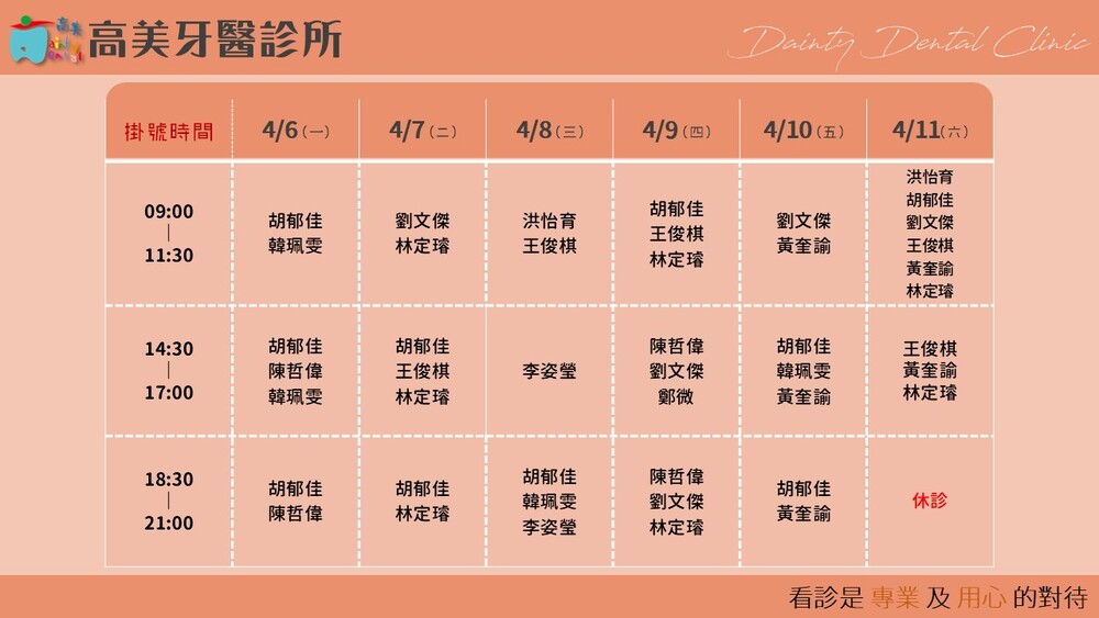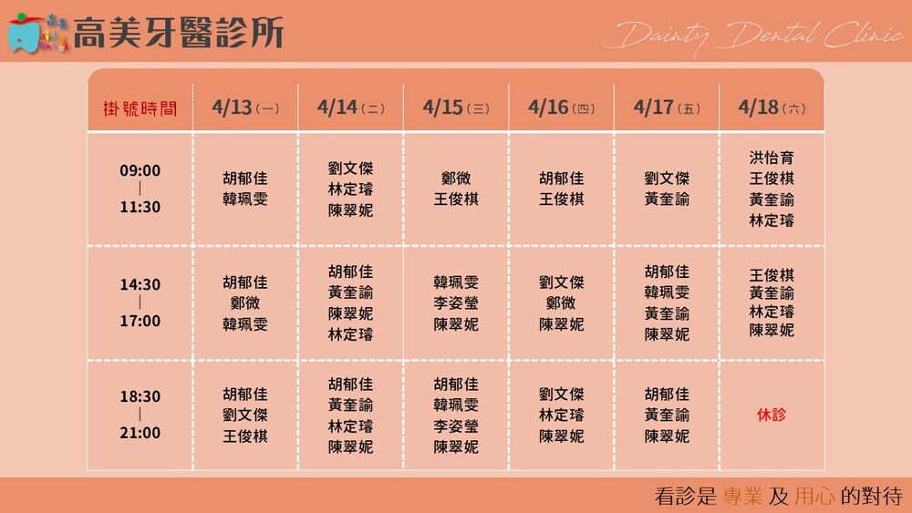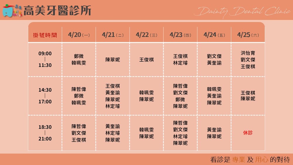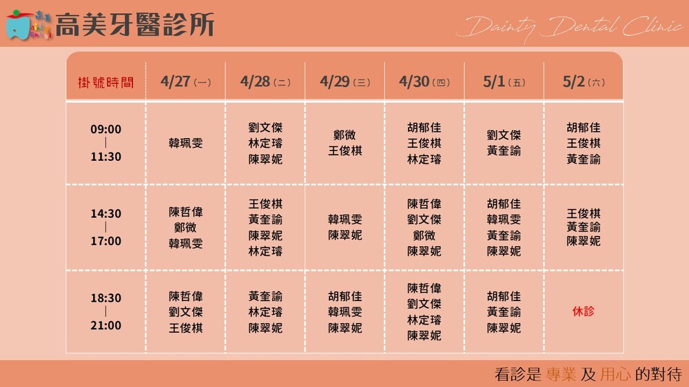 |Dainty Dental Clinic| 高美牙醫診所 |電話|(07)555-5898 |傳真|(07)555-7742 |地址|高雄市鼓山區美術館路32號 歡迎來電預約看診。 高美牙醫聯盟 關心您!